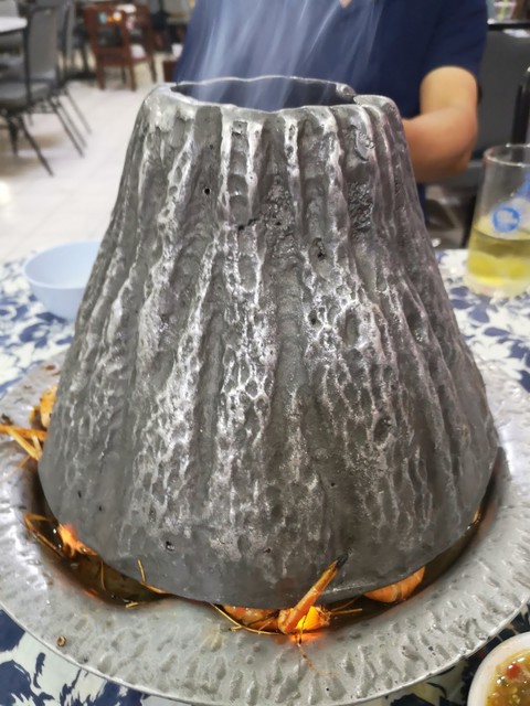 続いて手長エビを2キロ頼んだクンオッププーカオファイが火山を模した金属の蓋をかぶって出てきます。オーダーは重さ単位なのです。
