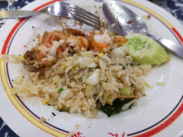 三人で二キロの海老と、トムヤムクンの海老と、海鮮炒飯の海老を平らげて腹パンです。