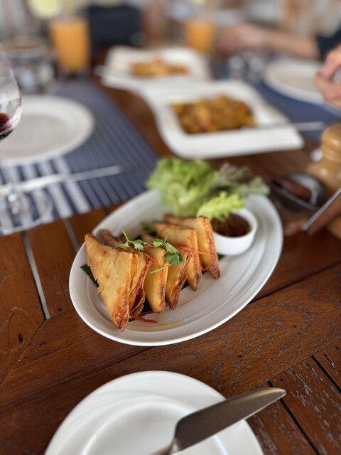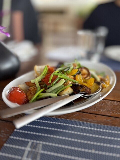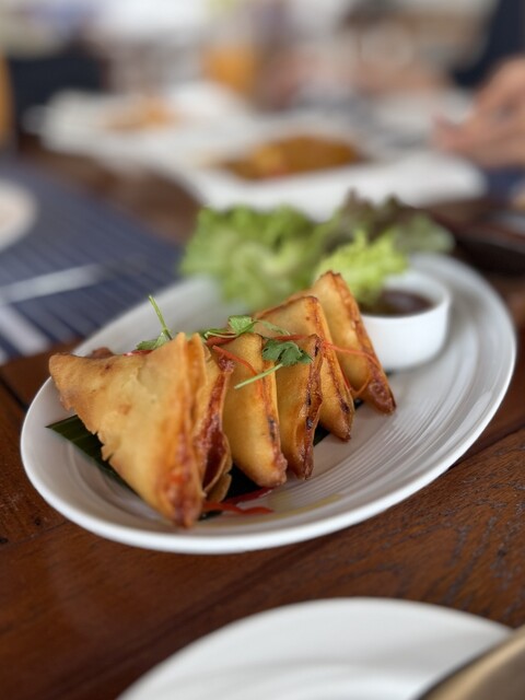 クリスピー春巻。中は海老とチキン。このぷるんとした食感とチキンの柔らかい食感がうまく組み合わさり食べ応えのある春巻。やはりタイのスパイスの効いたソースが美味しい。