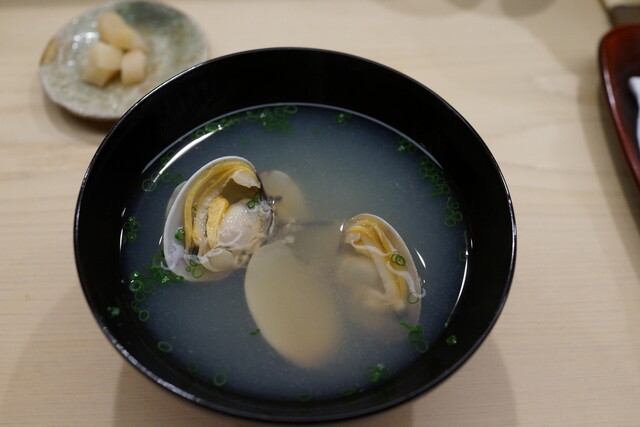 小肌、スミイカwith塩、巨大サヨリ、サワラ、春子昆布〆、中トロ、大トロ、ほっき貝、子持ちイカ、車海老、バフンウニ、穴子、玉、アサリ汁。ご一緒様が追加注文したカンピョウ巻を一口。