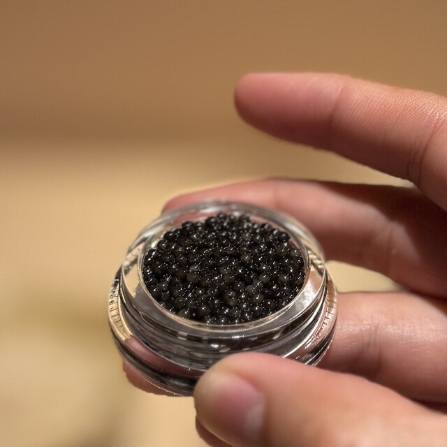 オリジナルキャビアの登場。海味のブランド名が入ったケース。これを小丼にして食べる。