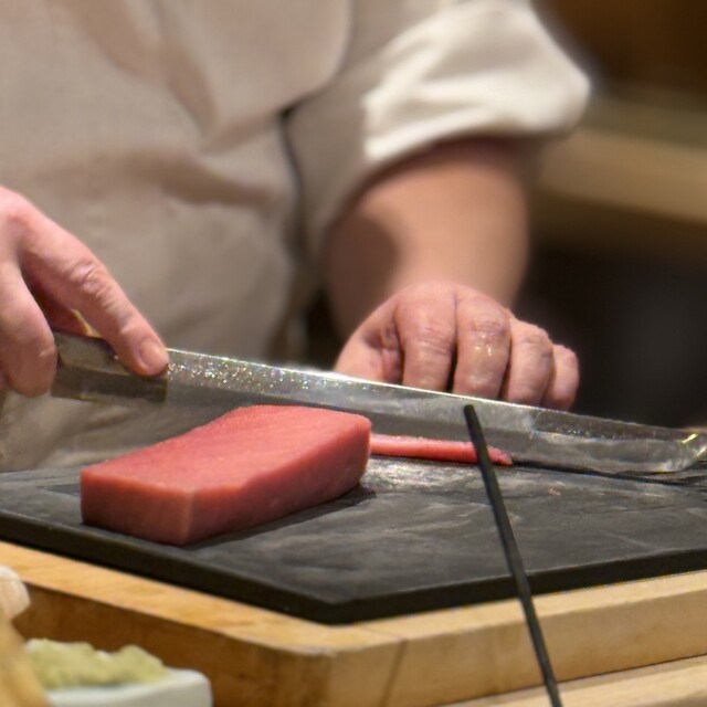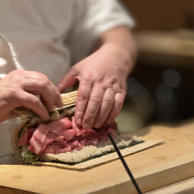 カットされたのどぐろを脂が垂れないように上から炭火で炙り。のどぐろの脂がジュルジュルと音がなり、見て聞いているだけで美味しく感じる演出もあるだろうが、上から炭火というのはなかなかな発想力、脂のノリすぎをうまく炙ることで握りに最高の状態に。そして、美味い。