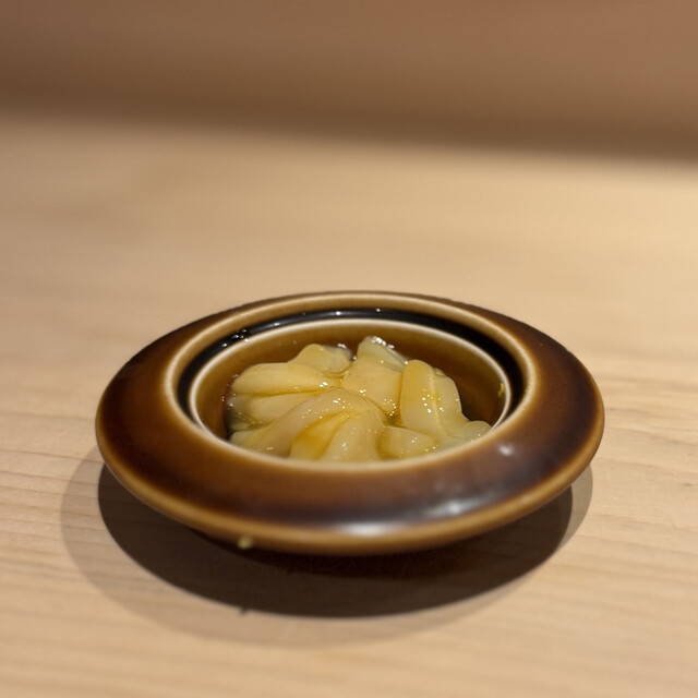 食感スルメイカ。食べていると雲丹の味と香りが立ち込めてくる不思議な一品。