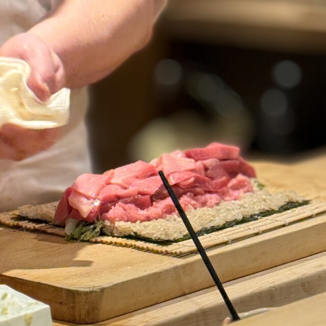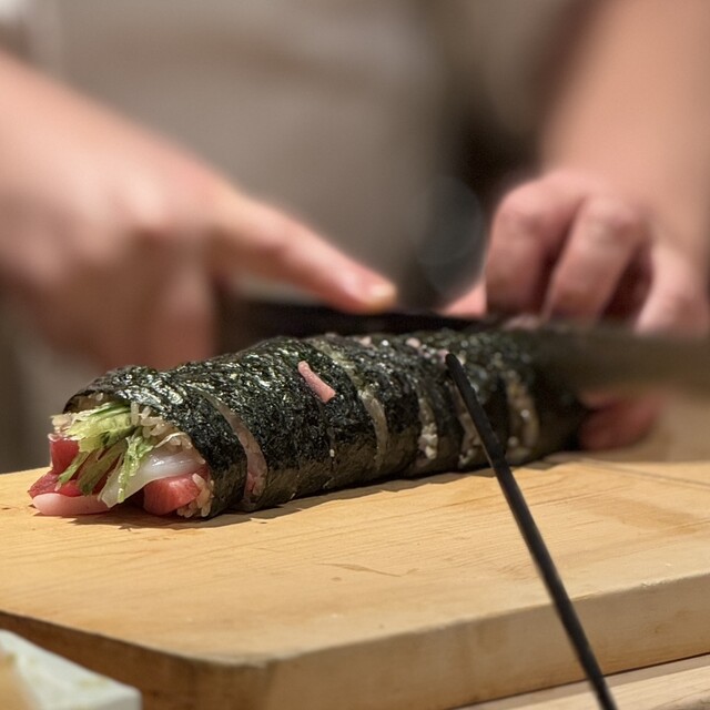巨大な太巻き。最初、すごい量の鮪を持ってきたので何をするのかと思いきや太巻きでした。