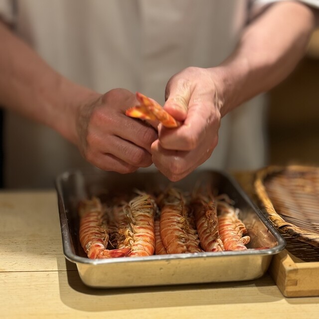 非常に艶のある牡丹海老を醤油で漬けての提供。かなりのねっとり感。これは美味い。