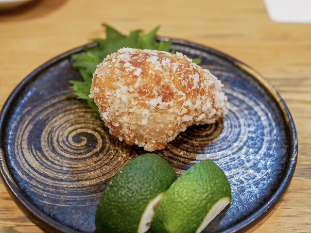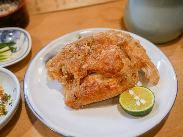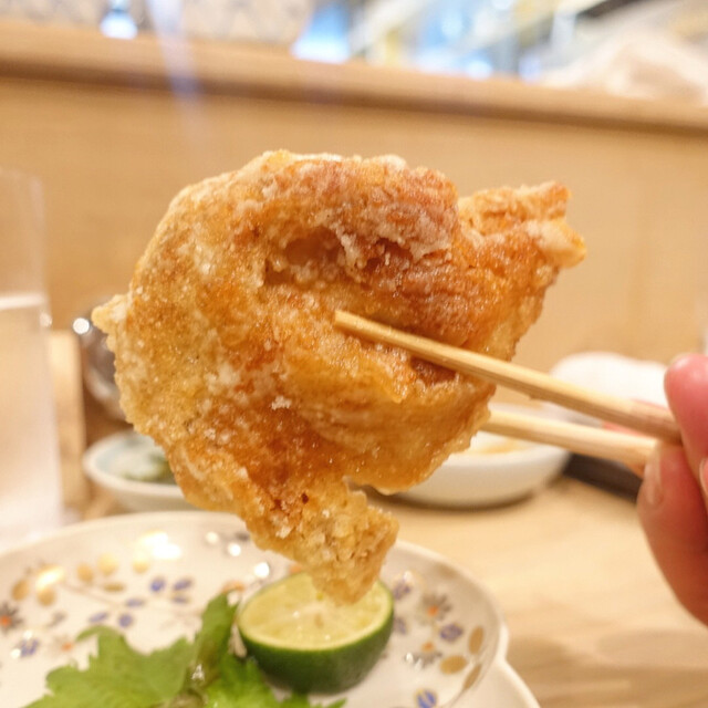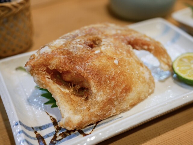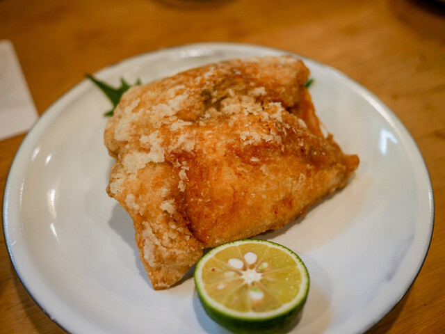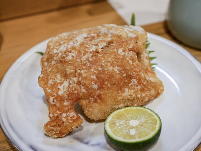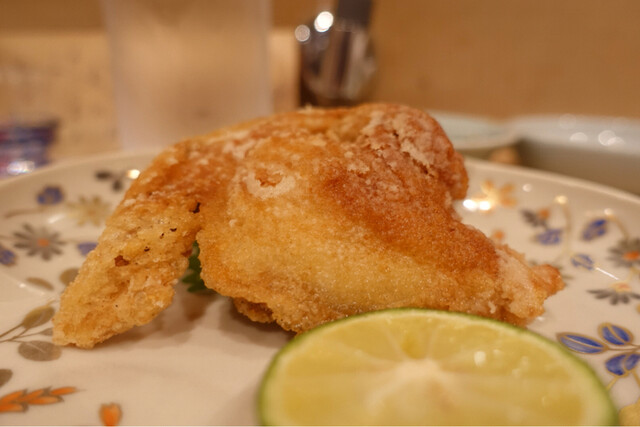 そして、から揚げ。サイズからして他では見かけないであろう巨大サイズ。本当にフライドチキンのようです。味付けも揚げ方も良くて、しっかり下味を付けた衣をたっぷりの油でカラッと。油の切れもよく油臭さなど皆無。サクッとした食感と旨みが閉じ込められた河豚の身のコントラストは今でも思い出すことができます。