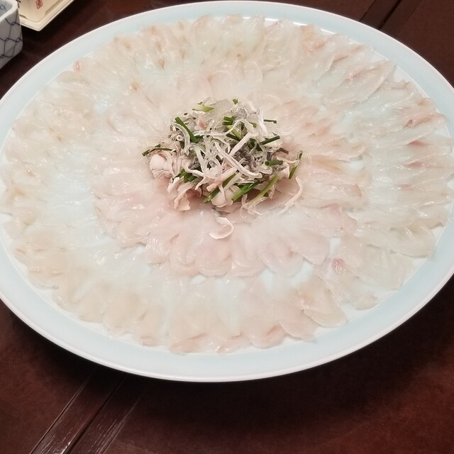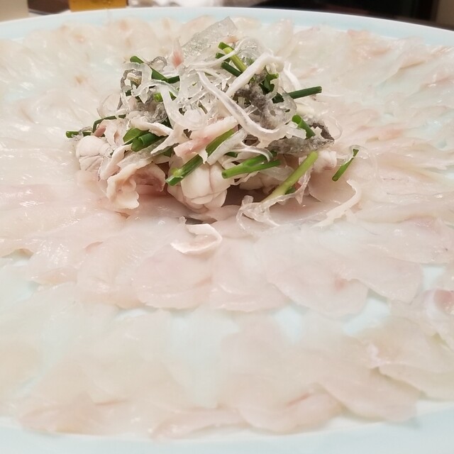 2日寝かせてあるというふぐの刺身、今までの私の食体験のそれとは全く違う厚切りに驚きました\(◎o◎)/!