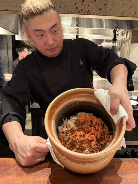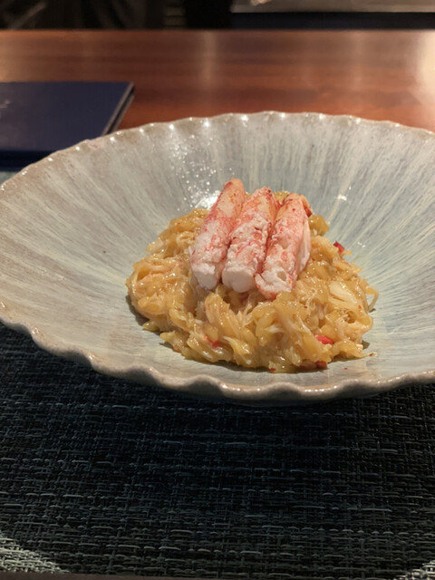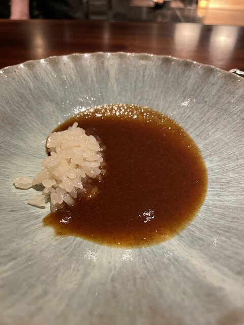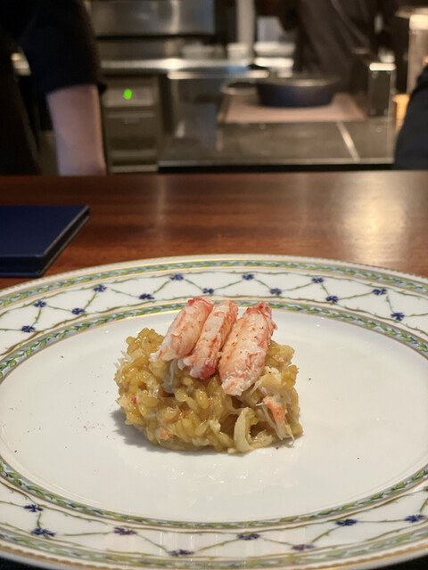 4. **赤座海老ビスク**(さかな人・長谷川さんより)と小西鮮道店の噴火待の毛のリゾットのコラボレーション。