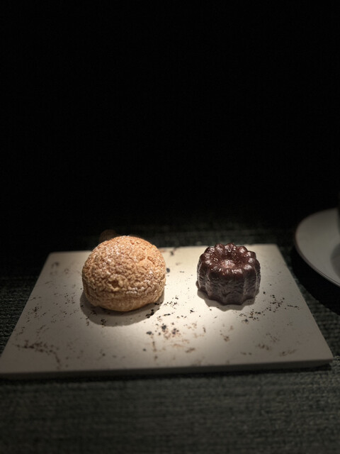 12. 最後は**シュークリーム、カヌレとコーヒー**で、食事の締めくくりにぴったりのフィナーレ。