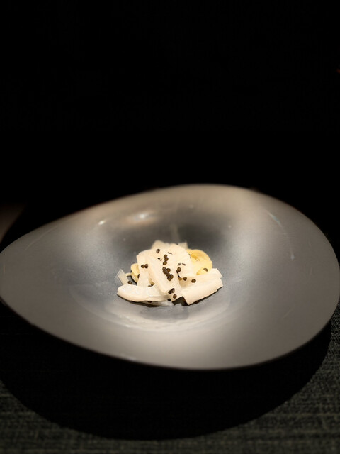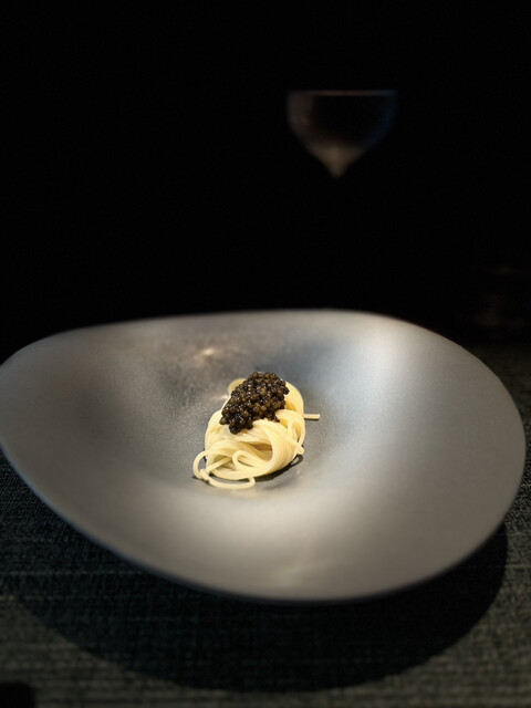 2. **オシェトラキャビアの冷製フェデリーニ**。新鮮な佐渡の黒飽と自家製バター、れんこん三兄弟の蓮根がアクセントになった贅沢な一皿。