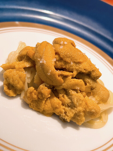 ●冷製フェデリーニ:キタムラサキウニ、大間、蛤出汁