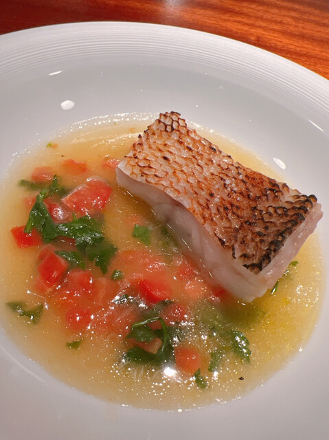 真鯛のコンソメスープです。2.5kgの大物。真鯛の塩味のみでいただきました。まるで鯛の炊き込みご飯のような香りがします