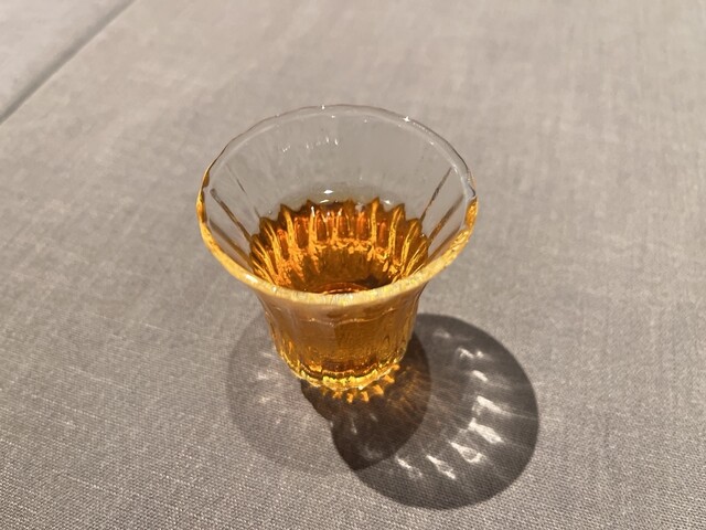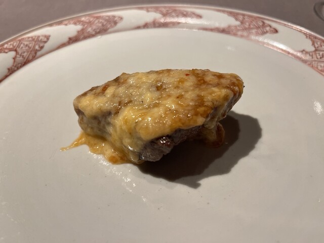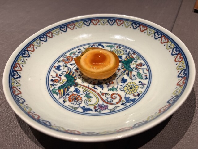 →通常の皮蛋よりも白身が黄金色で美しい黄金皮蛋は黄身と白身のバランスを考えたフィンガーフードに仕立てられて…濃厚な黄身の旨みに仄かに紅茶香る白身が良い塩梅でした(^^)