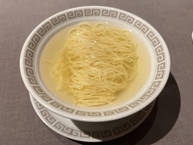 →〆の食事は何処までも清らかな鳥清湯スープが印象的な汁そば(^^)素晴らしいですね!更にこの清らかなスープに上海蟹入りのXO醬を追い投入!旨みは増しますが、それでもやはり清らかなのは凄いと思います!
