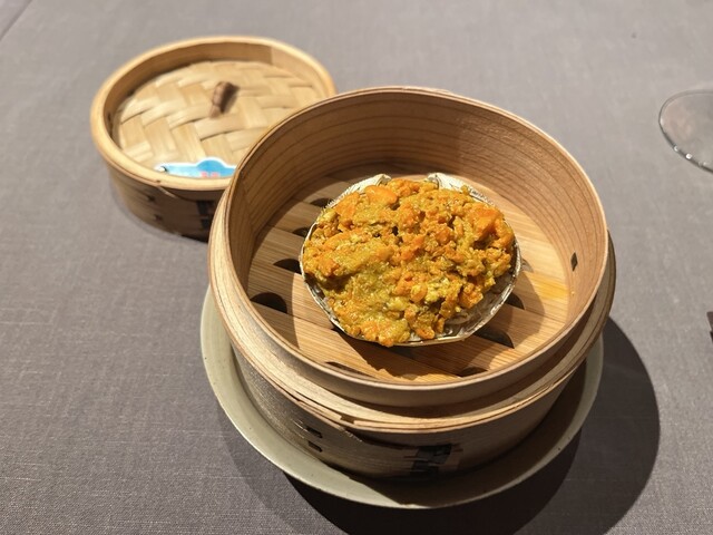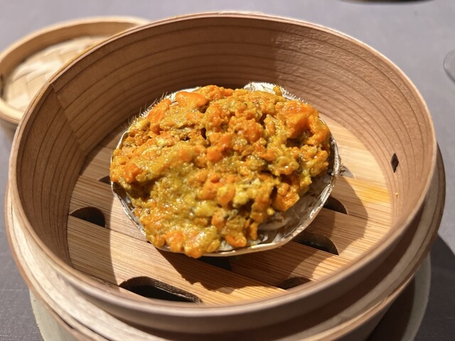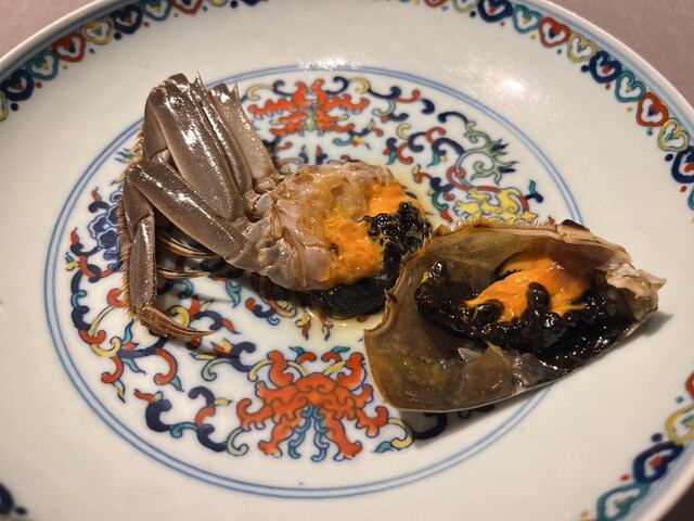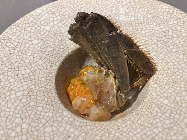→この時期香箱蟹ではよく見るのですが…上海蟹で見るのは初めての蒸し蟹\( ˆoˆ )/内子と身と白子の三層仕立ては言葉を同席者から奪ってしまう美味しさ♡こんなに上海蟹は濃厚ながらも清らかな旨みなんですね!上海蟹の概念が変わりました!!素晴らしい♫