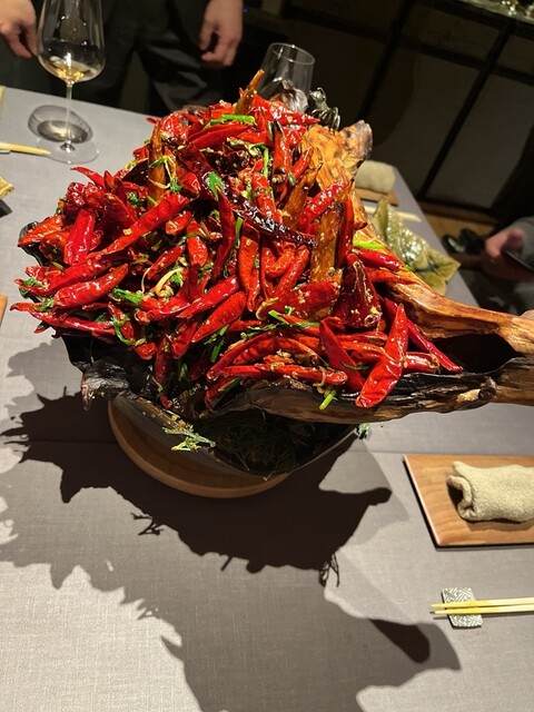 →続いては豪快な盛り付けの逸品!鶏の手羽がたっぷりの唐辛子の中に埋もれています(^^)その手羽をゆっくりと引き抜いて頂きますが、そのてはの中にも上海蟹!唐辛子の絡みは鶏の手羽がしっかりと防護してくれていますので、上海蟹の旨みには邪魔はさせていないのも見事ですね!