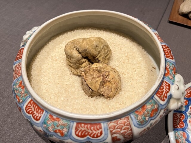 →更に更に"あかんヤツ"!先程の上海蟹餡掛けにお米を投入しておじや仕立てに♫と思っているとこの時期だけの白いダイヤであるアルバ産白トリュフをたっぷりけずり掛けるではありませんか!これは"もっとあかんヤツ"‼︎旨みと香りのスペシャルコラボに大満足でした\( ˆoˆ )/