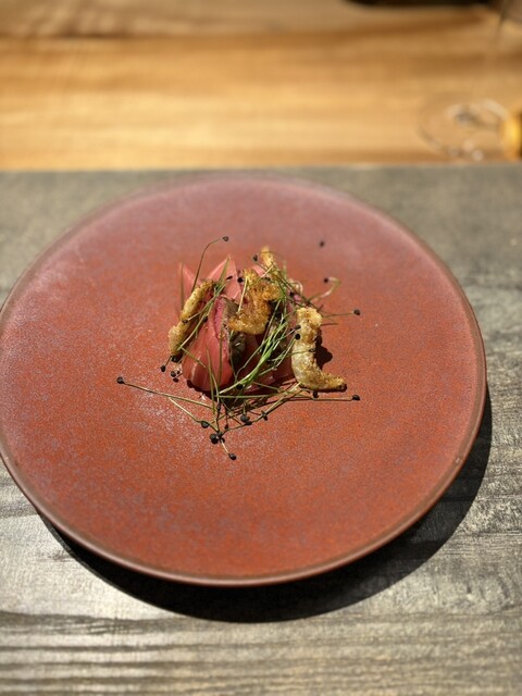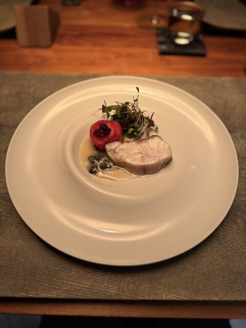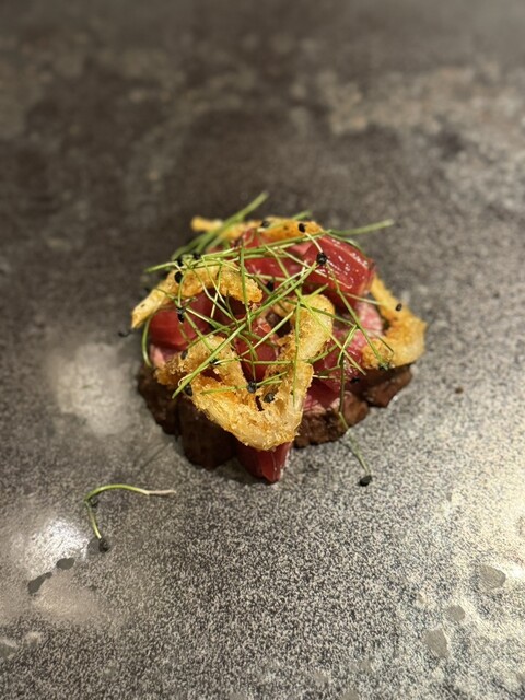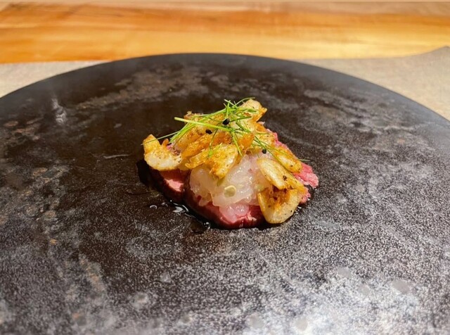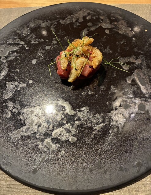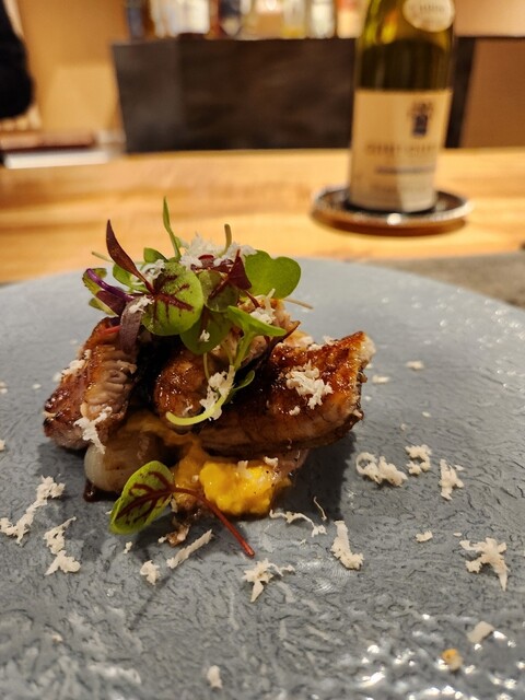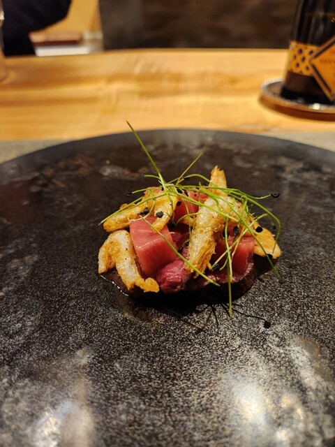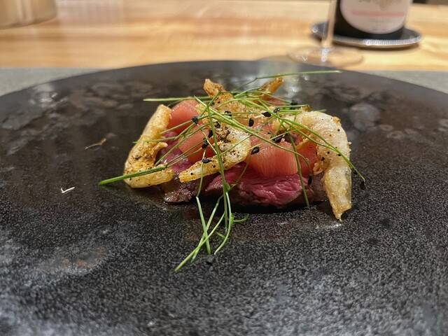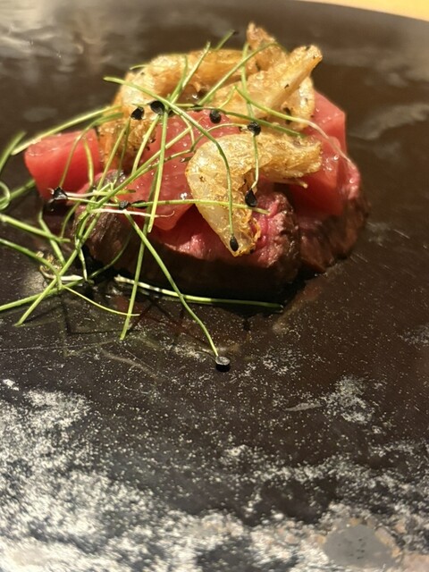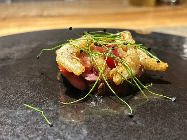 出てくる一品一品はどれも感動レベル。個人的に、どハマりしているお店。 一品目から鹿肉とマグロの組み合わせに驚かされたのと、クエと、和牛のメイン料理に大感動! 最後のデザートまで抜かりないコース。次は来...