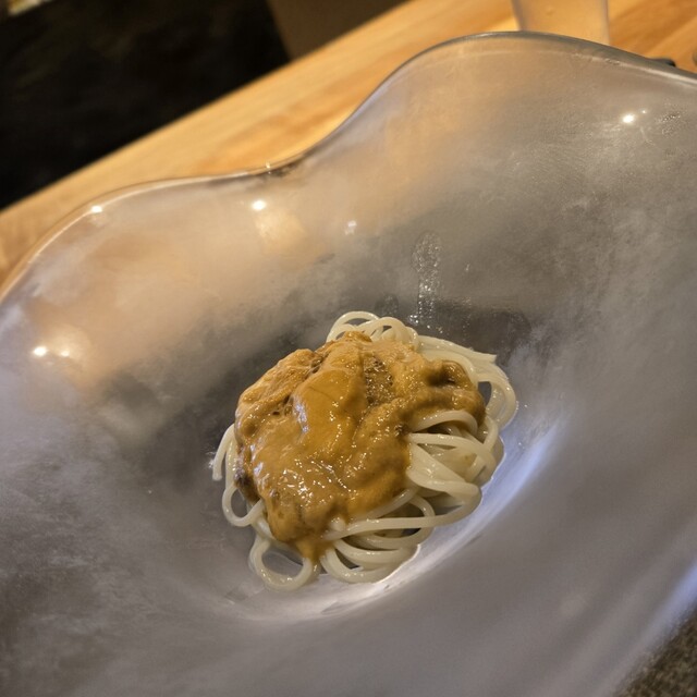 生雲丹のパスタ 蛤と酢橘のジュレ
