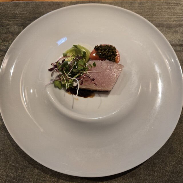美しいレアの白カジキにキャビアをたっぷりとのせた静岡県掛川市石山農園の幻のトマト、ソースは熟成バルサミコのソースとアボカドと鶏出汁のソースを合わせた1皿。
