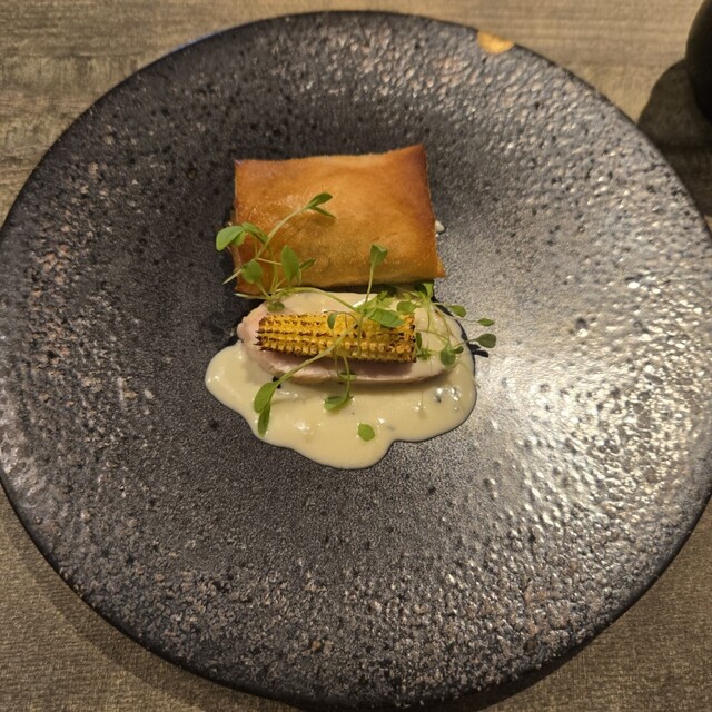 丹波黒どりのむね肉の上にヤングコーンの炭火焼きをのせ、春巻きのような丹波黒鶏のもも肉ミンチのパイ包み揚げ焼きと合わせた1皿。
