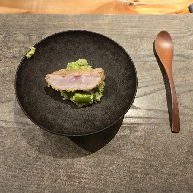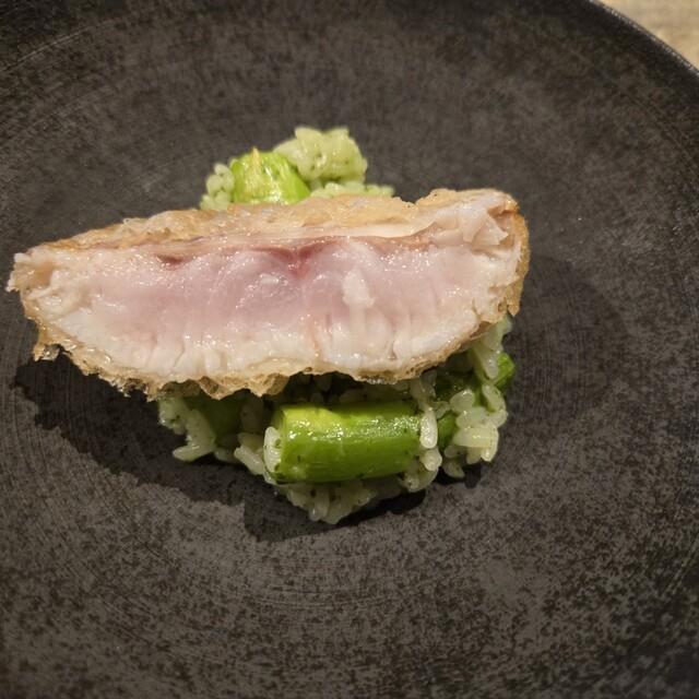 石川県輪島産1㎏程のノドグロを蒸し焼きにした後フリットに仕立て、北海道産グリーンアスパラガス、バジルのリゾットの上にのせた1皿。