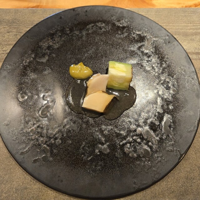 富山県産黒鮑を酒蒸し、昆布〆して炊き上げ、千葉県産ふわとろ茄子の炭火焼、鮑の肝と卵黄のマヨネーズ、鮑の出汁のソースを合わせた1皿。