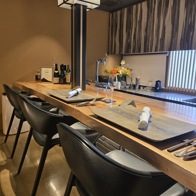 奇跡的にOMAKASEからの予約に成功、お連れ様と2名で伺い、店前で待機してくださっていたスタッフさんに案内いただき2階へと上がり、久しぶりの次広 哲司シェフに迎えていただきカウンター席へ。