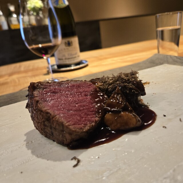 メインは熊本あか牛のフィレ肉を割下でじっくり火入れした後に炭火で仕上げ、キタアカリのロースト、赤ワインとフォンドヴォーに割下とポルチーニを合わせたソース、オーストラリア産黒トリュフ、七味の肉じゃが仕立てとした1皿。