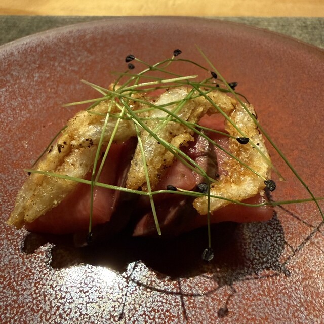 出てくる一品一品はどれも感動レベル。個人的に、どハマりしているお店。 一品目から鹿肉とマグロの組み合わせに驚かされたのと、クエと、和牛のメイン料理に大感動! 最後のデザートまで抜かりないコース。次は来...