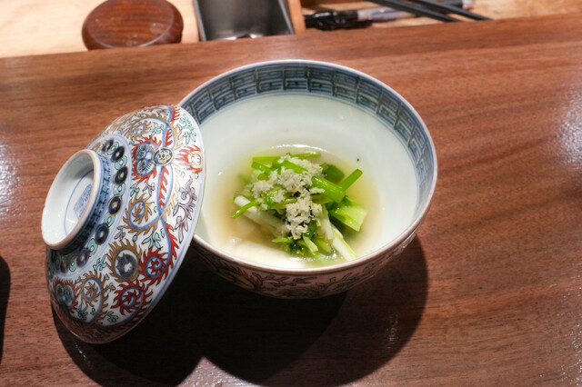 三葉の煮浸し、つゆは高坂鶏からとったもの