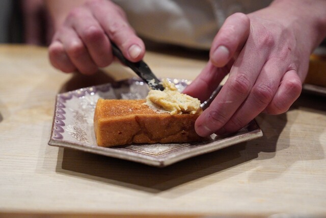コースの提供を終えた疋田さんは、仕事中とは別の表情。ホッとして脱力感が、職人オフモードと言ったら失礼かな笑