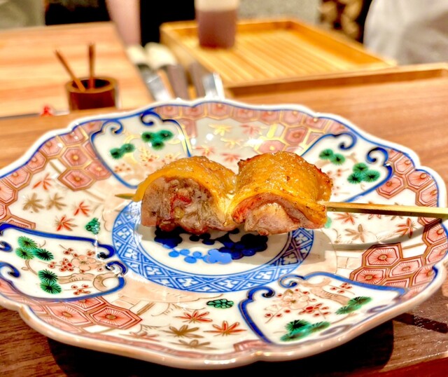 串は高原比内地鶏のモモからスタート 皮目こんがり、熱々でジューシー!