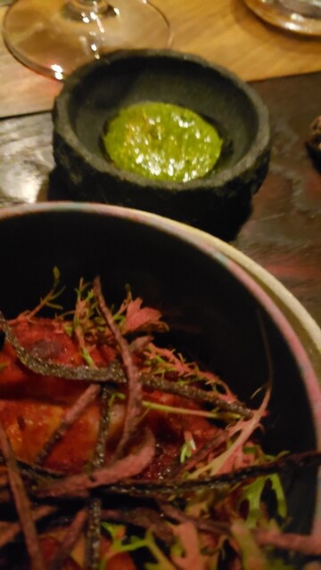 イノベーティブレストランに行くときは覚悟がいる。なにも考えずに食べても美味しいのは当たり前として、その料理に隠されたシェフの意図を知るには五感を研ぎ澄まさなければならない。この店はご存じのようにペルー料理のトップを走るが、中でも標高という概念で料理を再構成している。食材はペルーから来るものが多いが、日本でも栽培しているという。しかし、知らない食材の多いこと。ちょっと暗めのインテリアで、食事とペアリングしてこそ楽しめる料理の世界だ。