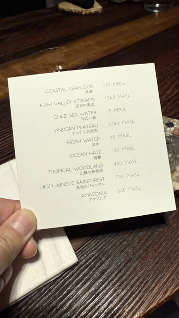 テーマは『海抜ごとの食材』。海抜-35mから3680まで海から山までまだ食事の旅をします。
