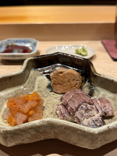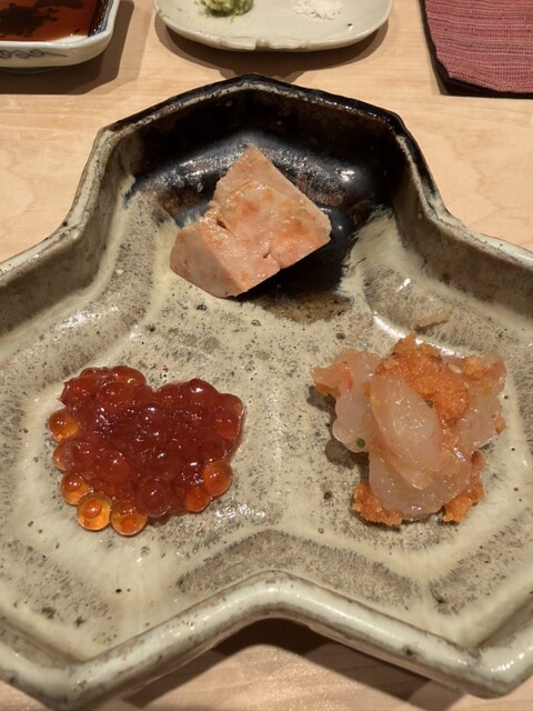白子、しゃこ、えんがわの混ぜご飯、スペシャリテのいわし、おつまみ3点セット(こもち鮎、あん肝、毛蟹)