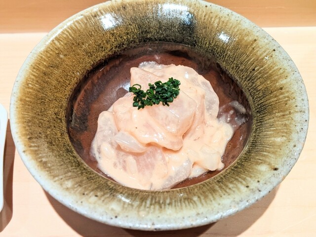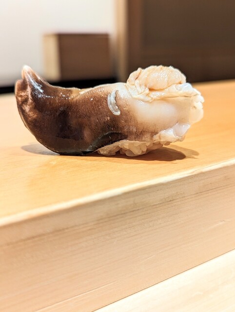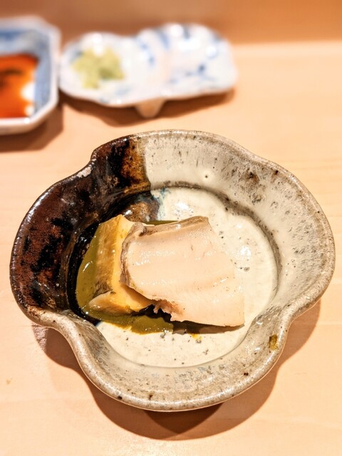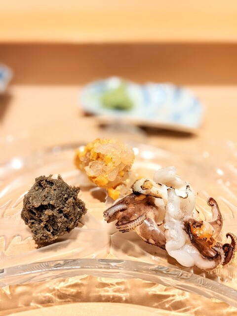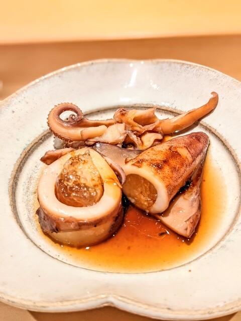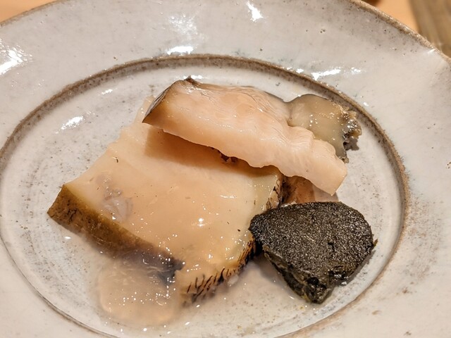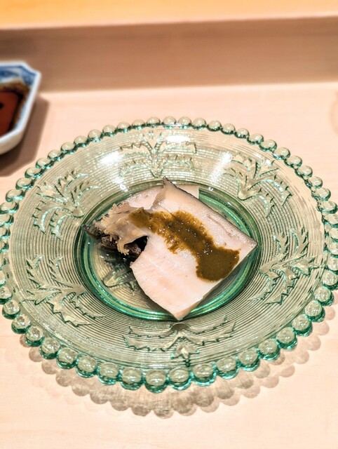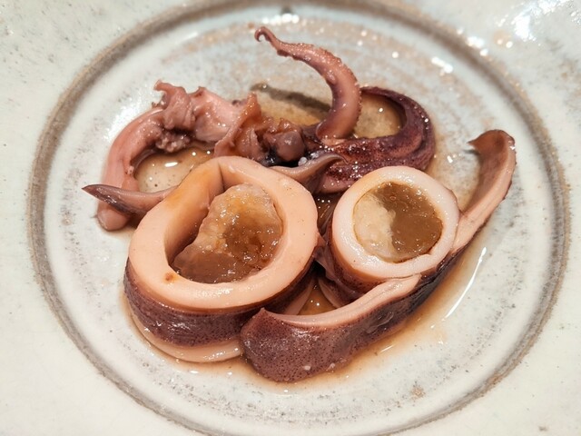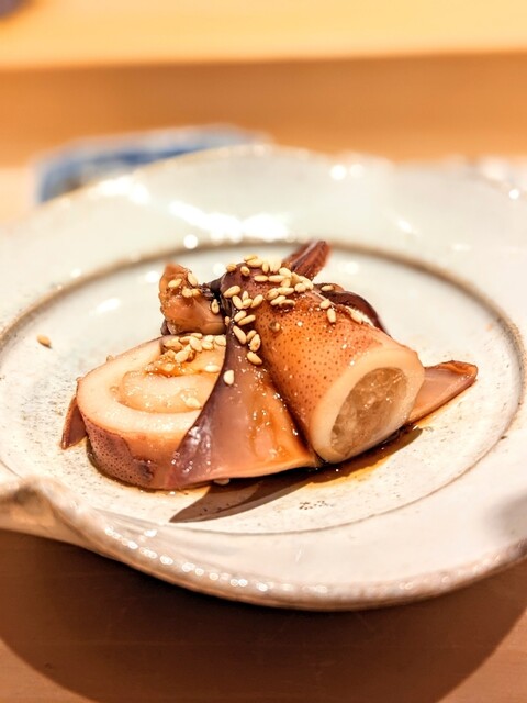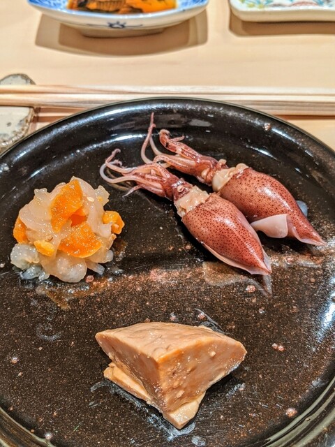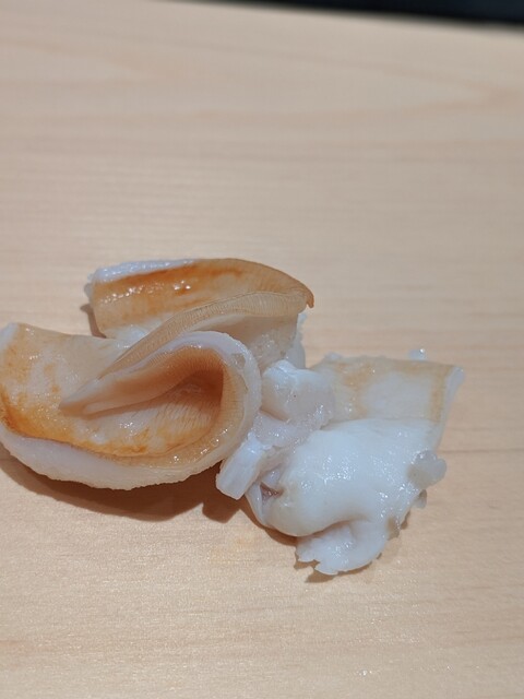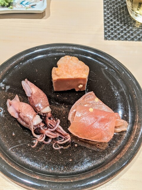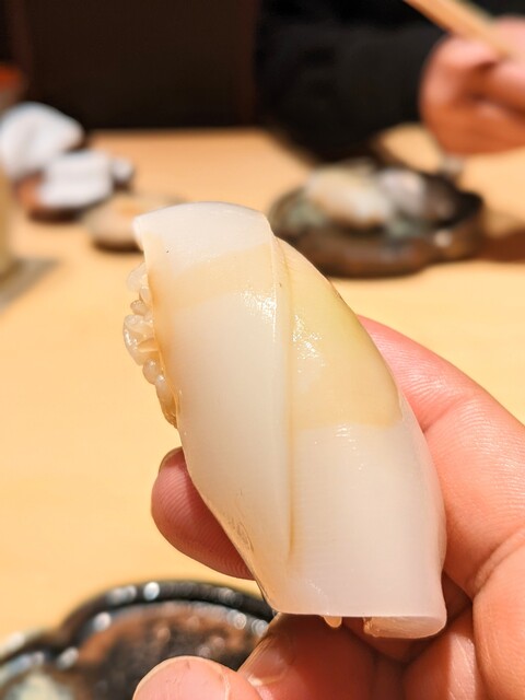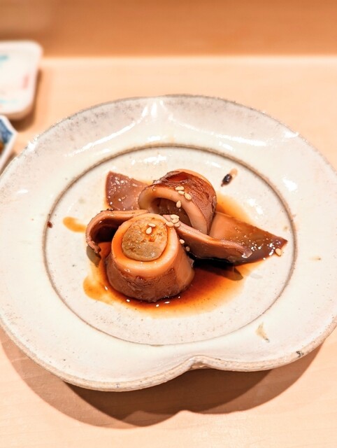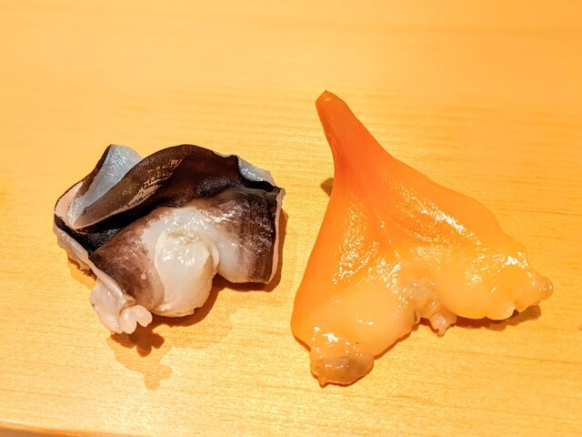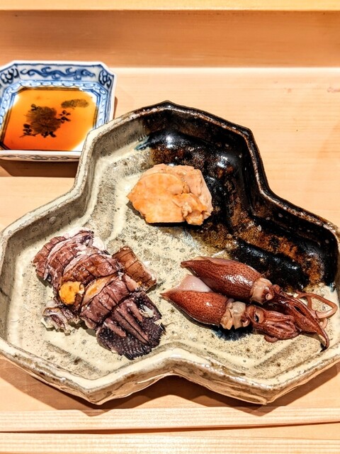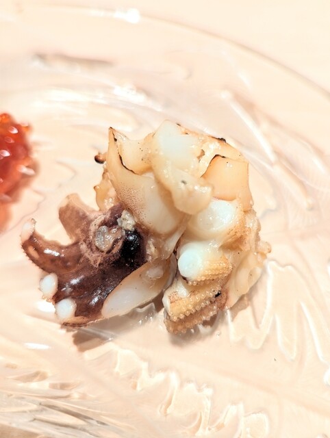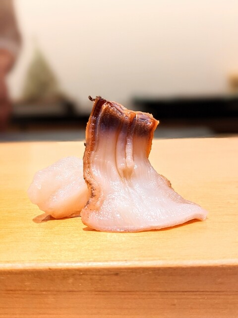 ●鮑の肝ソースにシャリ アオリイカの縁ペラ