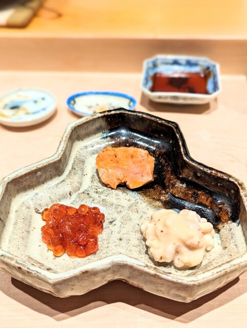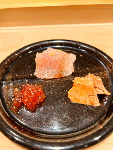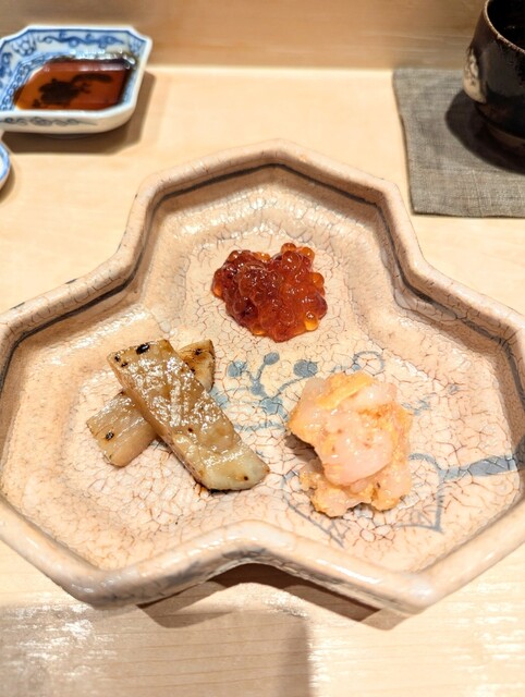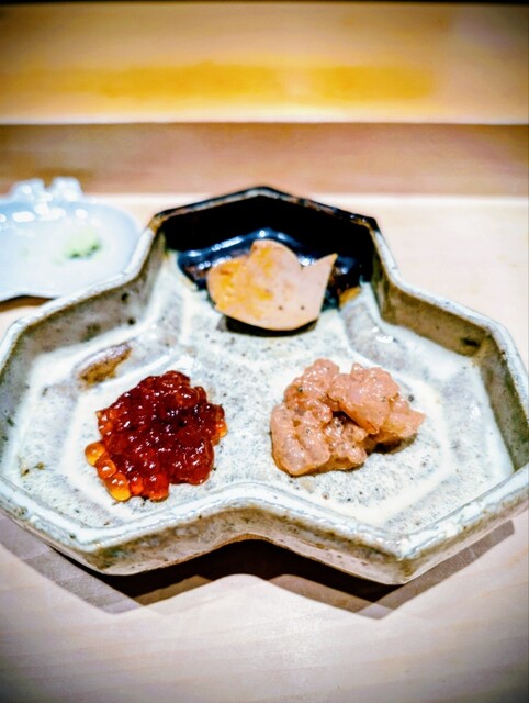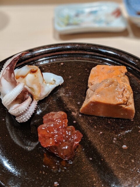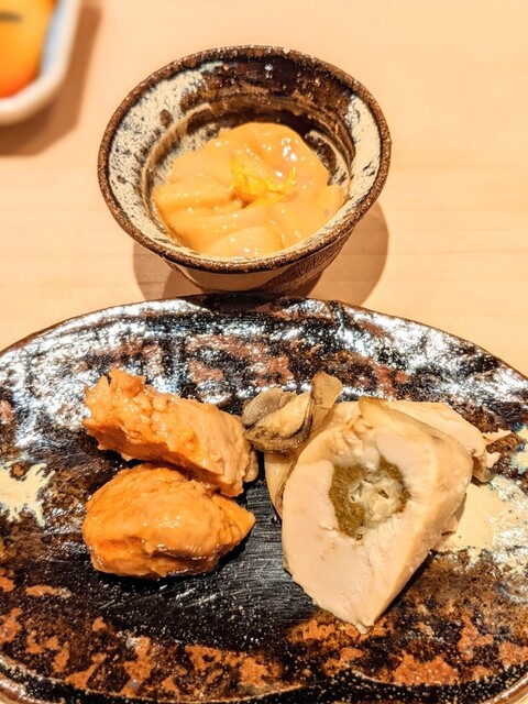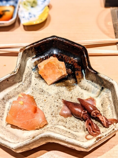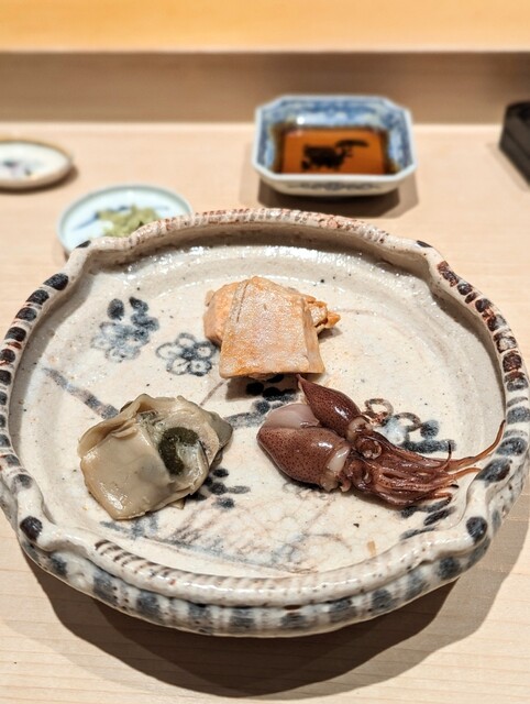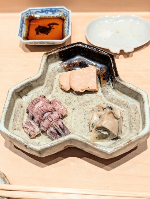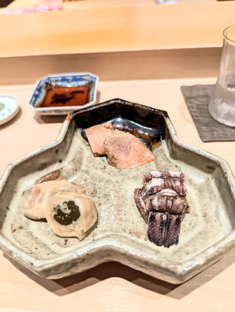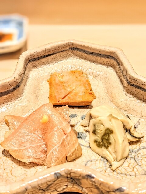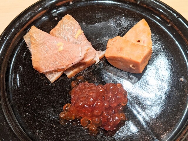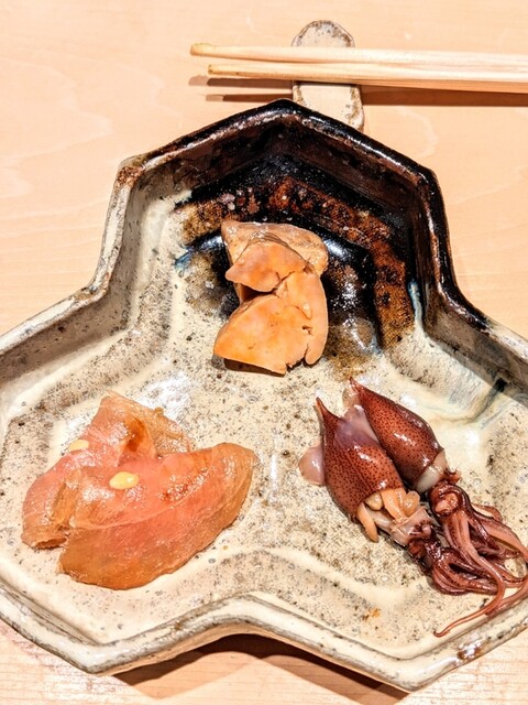 ●珍味の三点盛り ホタルイカ、あん肝味噌漬け、牡蠣の味噌漬け