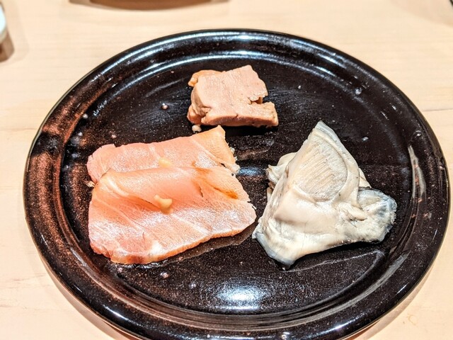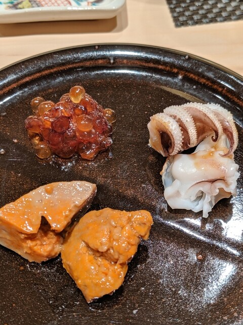 おつまみでは珍味3種盛り ホタルイカ味噌漬け、牡蠣味噌漬け、あん肝が美味しく酒のあてにバッチリでした