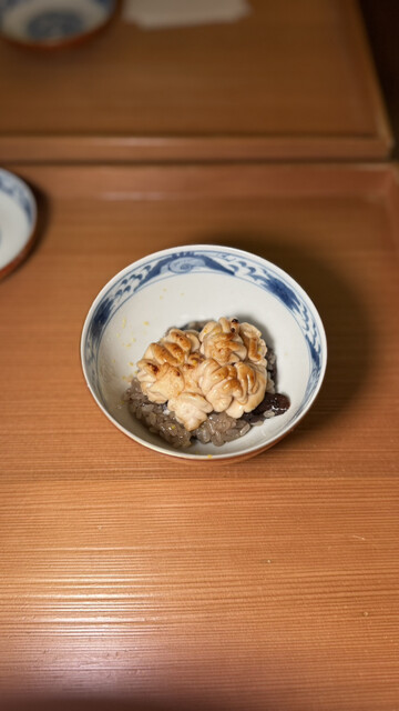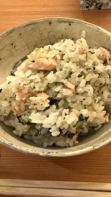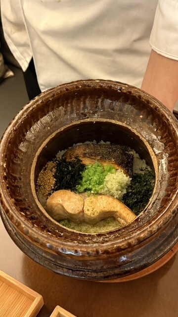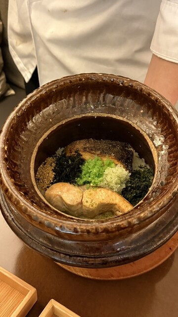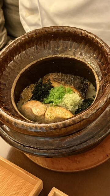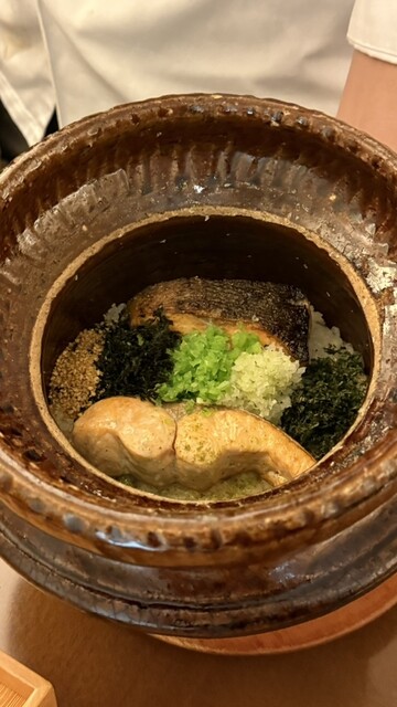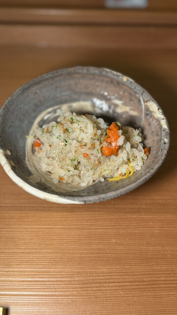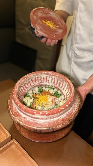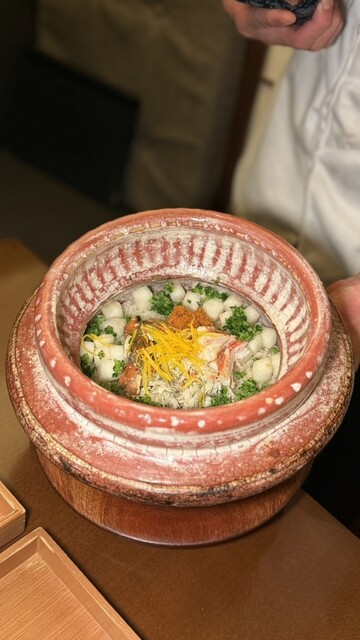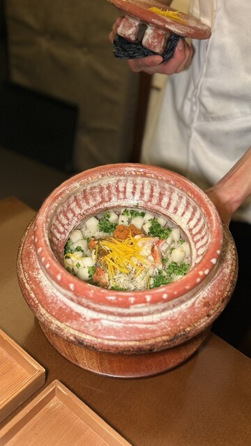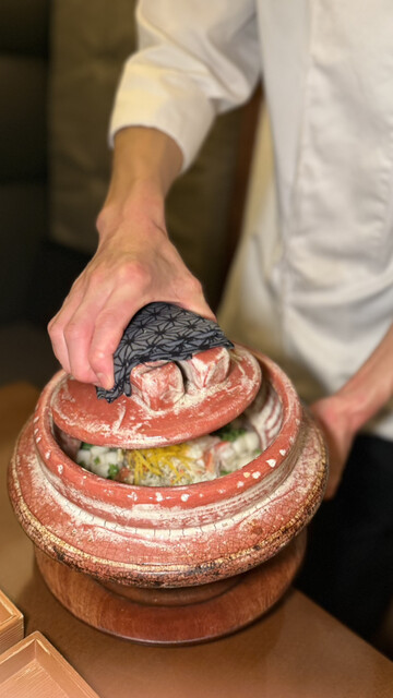 締めは香箱蟹と蕪を使った土鍋ご飯。土鍋の蓋が開くと、蟹の香りと炊きたてご飯の香りが一気に広がります。ご飯は一粒一粒が立っていて、香箱蟹の内子や外子の食感がアクセントになっています。蕪は柔らかく、優しい甘さで、蟹の旨味を受け止めています。