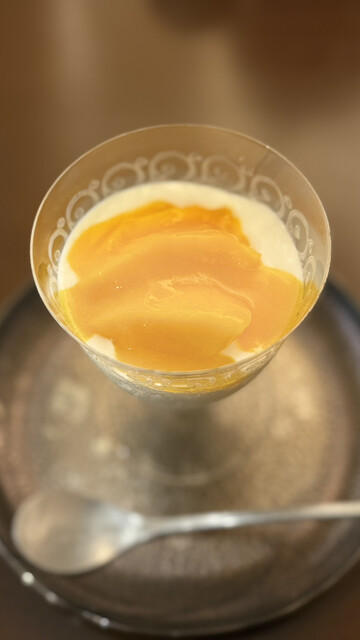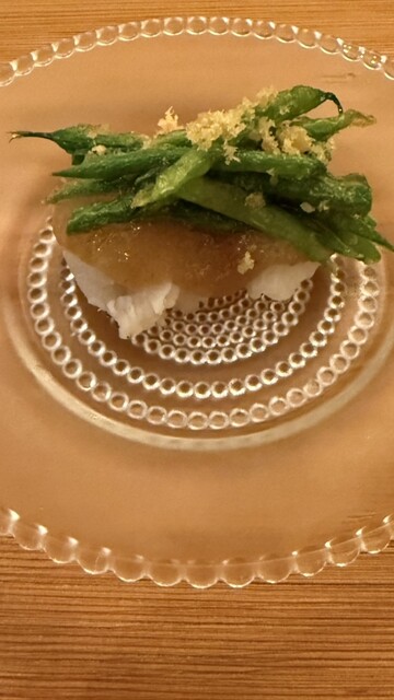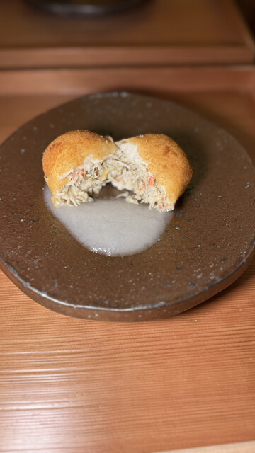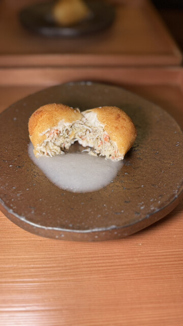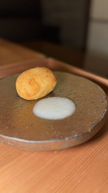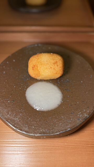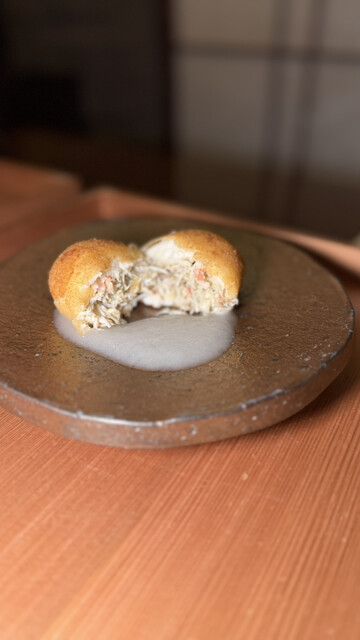 イチオシとして挙げた一皿です。揚げたてで提供され、衣は薄く、噛むとさくっとした軽い食感です。中には越前蟹がたっぷりと使われており、一口目から蟹の香りと旨味を強く感じます。中身はとろとろになりすぎず、蟹の身の存在感が残るように仕上げられていて、噛むほどに味わいが続きます。玉ねぎのソースは甘さとコクと酸味があり、蟹の風味を邪魔せずに全体をまとめてくれます。コースの中でも特に記憶に残る一品でした。