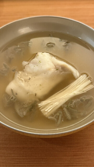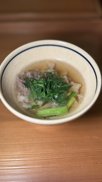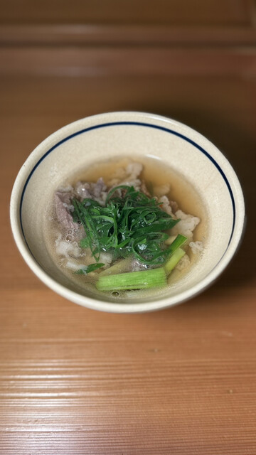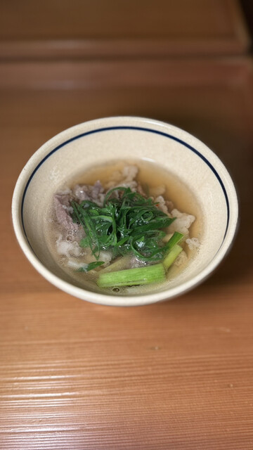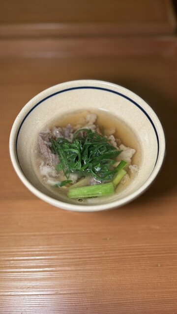 メインとして供された月輪熊のしゃぶしゃぶ。薄切りの熊肉を出汁にくぐらせていただきます。短めの火入れで仕上げると肉は柔らかく、旨味がしっかりしていますが、重さを感じさせないバランスでした。出汁には熊の脂の旨味となめこのぬめり、九条ネギの香りが重なり、飲むごとに深さが出てきます。終盤になると出汁自体がさらにおいしくなり、そのままスープとしても満足感のある味わいでした。冬の夜に合う力のある一皿です。