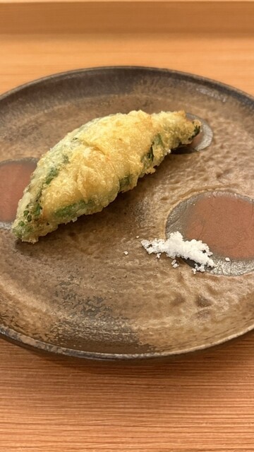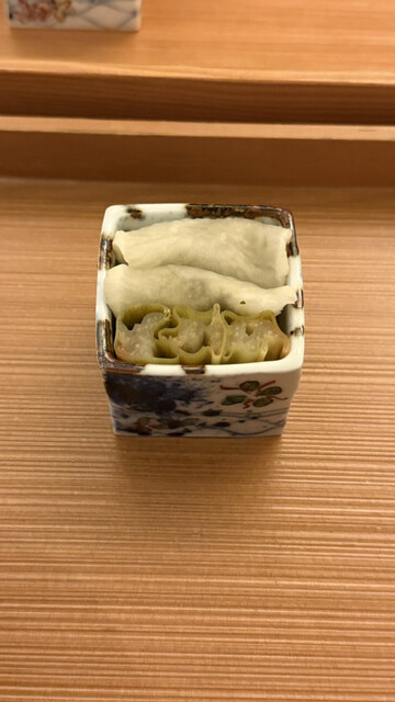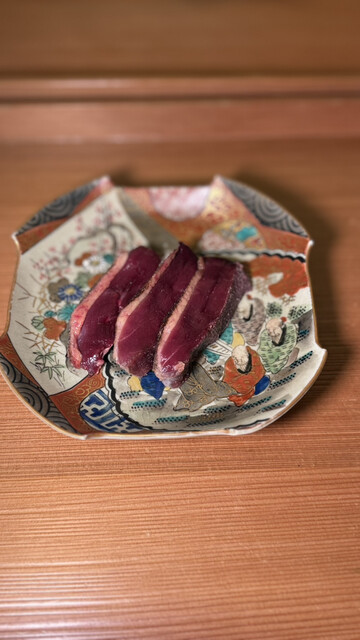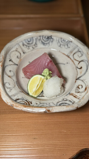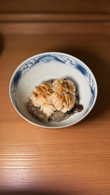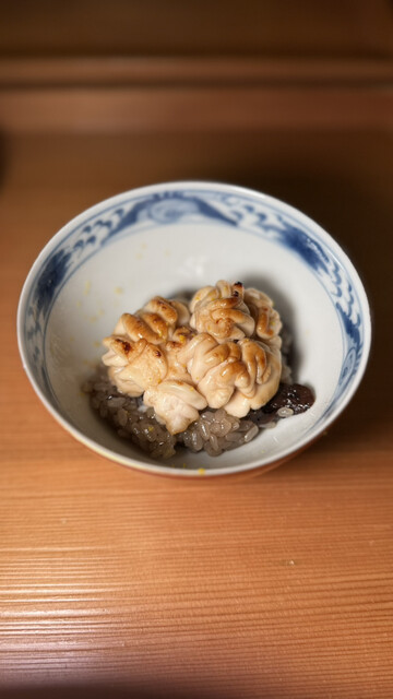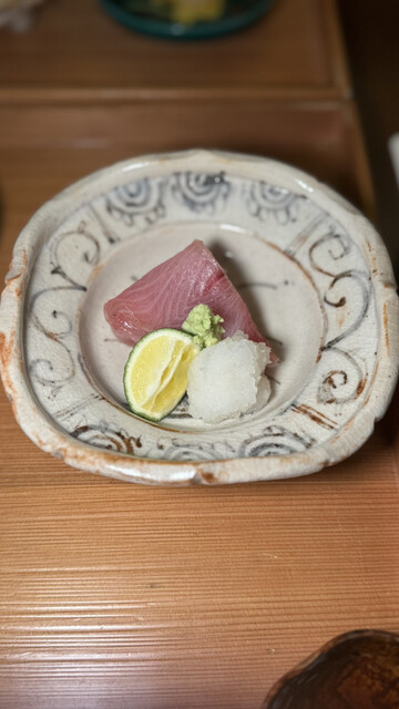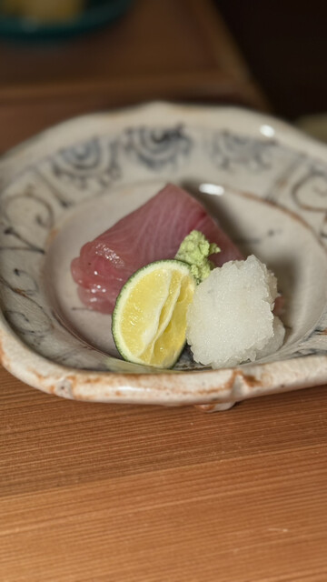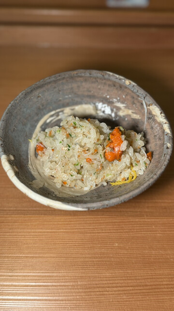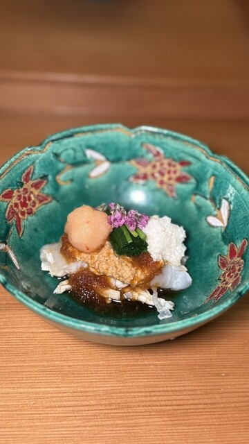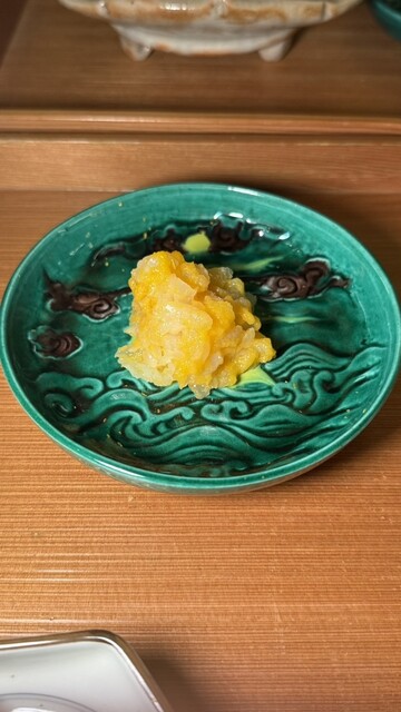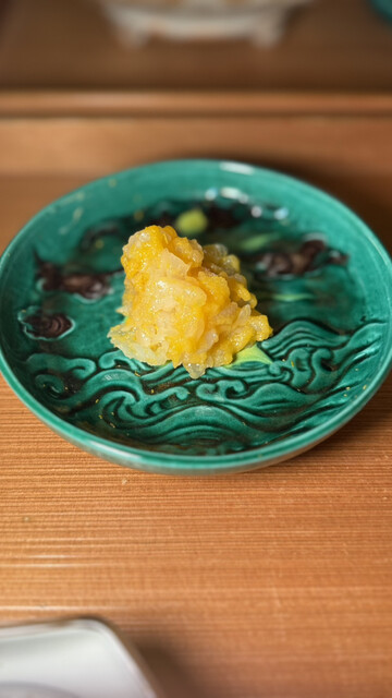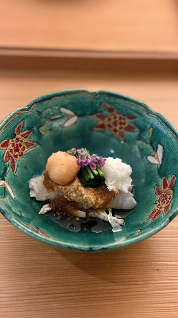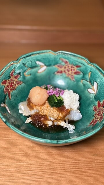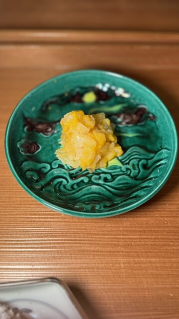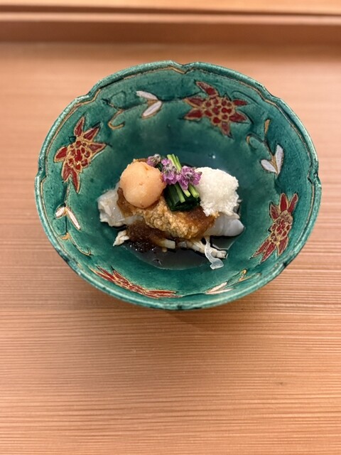 薄く引かれたトラフグに、あん肝、もみじおろし、刻んだフグネギ、長芋が組み合わさっています。トラフグ自体は繊細な味わいですが、あん肝が加わることで、口の中にしっかりとしたコクが生まれます。もみじおろしの辛味と酸味が全体を締め、長芋のしゃきっとした歯触りが軽さを与えてくれます。一口ごとに、フグの旨味、あん肝の濃さ、薬味の爽やかさが順番に感じられる構成で、日本酒が自然と欲しくなる一皿でした。