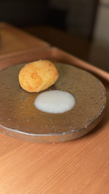 冬の楽しみとして期待していた一皿です。衣は薄く、きれいに揚がっていて、フォークを入れると中から蟹の香りがしっかり立ち上がります。中身はクリームよりも蟹そのものを感じる濃さで、身の存在感があります。口に入れると最初に蟹の風味が広がり、そのあとにクリーミーな舌触りと玉ねぎの甘さが続き、最後に衣の香ばしさが残ります。量も適量で、コースの中盤で気持ちがぐっと高まるポイントになりました。