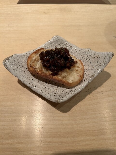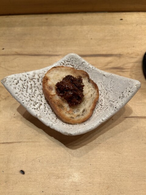 鶏の7種の部位を使用し、煮込んだ後に寝かせたものをバケットにのせた品を