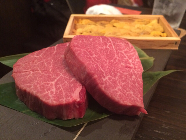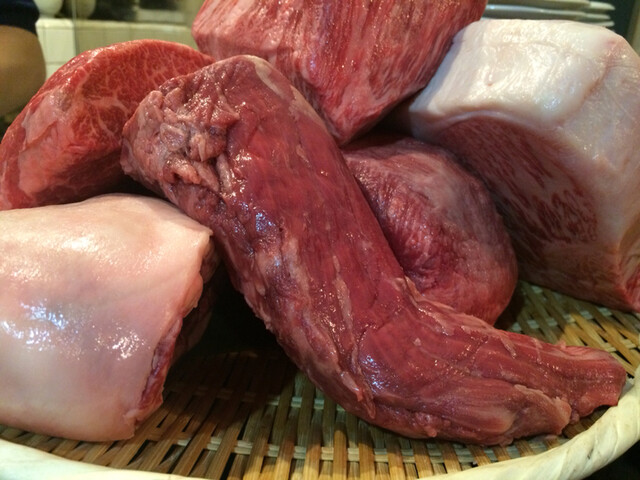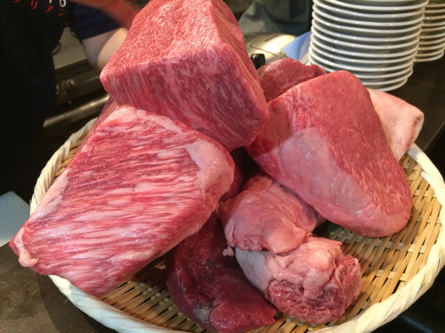 お肉は、お店の看板にも出ているように「九州和牛」(九州産の和牛)を使っています。あちらの方面に強い仕入れルートを持っているということで、宮崎、佐賀、熊本、鹿児島産などの良い肉を惜しげもなくどーんと出していただきました。カットされる前の塊肉も見せていただきましたが、どの肉も綺麗な色をしていてどれも生でもいけそうな感を漂わせてます。