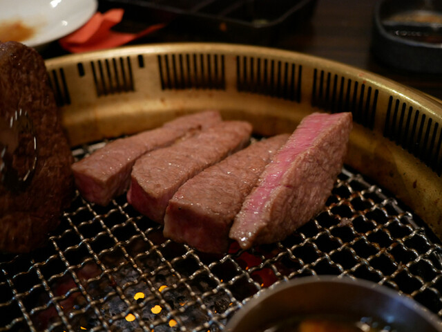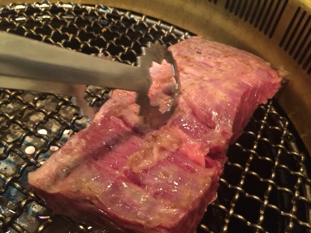 焼きもの2つ目はハラミ。これは塊の状態で焼いて、最後にカット。焼き方はレアな部分を残しつつ中まで熱を入れるために、一旦焼いたものを取りだしてアルミホイルで包んで余熱を使うという焼き方。外資系のステーキハウスなどがやってる焼き方ですが、すごいのはここからで単に余熱で中まで熱を入れて終わりではなく、また再びアルミホイルから取り出し網に乗せて熱を加えるという焼き方。確かに余熱で焼き上げるという調理法は中まで熱を入れるには良い方法なのだが、これだとどうしても肉そのもののの温度が下がってしまい、旨みはあるもののやや冷めた状態で客に出てくるので、個人的にはイマイチな調理法だと思っていたけど、こうやってまた最後網で焼き上げることで外は熱々、中はレアながらもきちんと熱が入ってるという最高の状態でお肉をいただくことができます。このハラミの焼き方で完全にヤラれてしまいました。