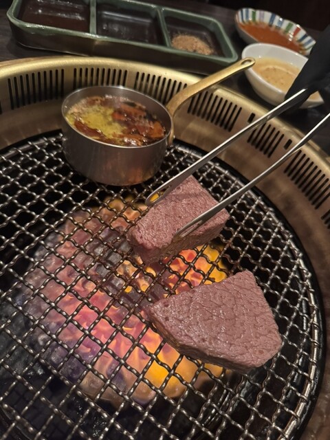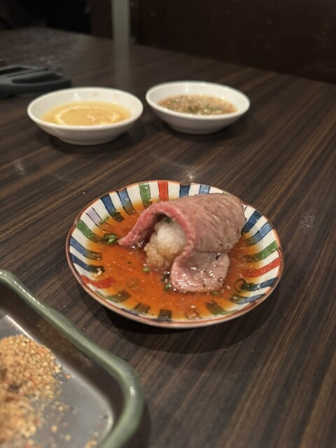 赤みも塩もタレも美味しい〜全てのお肉が噛まずに行けるレベル。さっぱりと大根おろしを巻いて食べるお肉やすき焼き風の生卵をつけるお肉も。