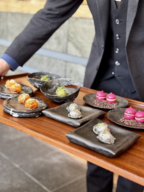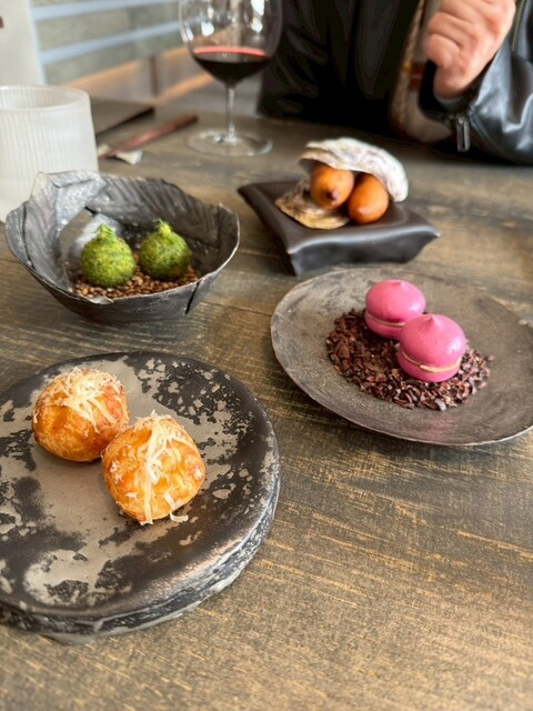 ✔︎prologue〜ヤギのチーズと満寿泉酒粕のグジェール、赤ビーツのメレンゲレバームース、白エビタ...
