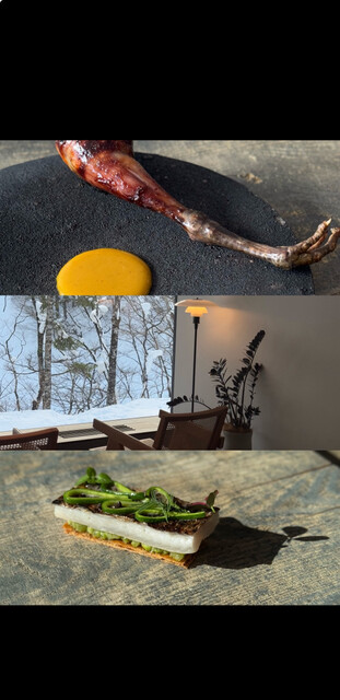 一方、看板料理の鶏料理は山野の清らかな気配をまとっている。どぶろくに一晩漬け込んでから風乾し、中には熊の心臓、手掌、脂肪、内臓が詰められている。肉質は少年の筋肉のように引き締まっているのに、ほぐれると絶妙なうまみが広がる。爪先まで見ていると、この鶏が生前歩んだ山道のすべてが、舌先で溶け出すように感じられる。